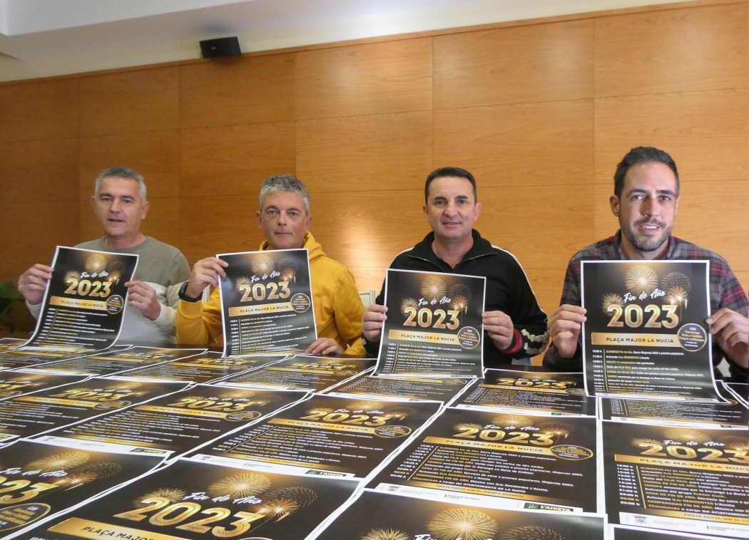 En la presentación de esta “Gran Fiesta de Fin de Año” participaron Baptiste Llorens, presidente Majorals 2023-Penya L’Aixeta, Diego Llorca, pte. Associació Penyes de La Nucia, Cristóbal Llorens, concejal de Fiestas y Bernabé Cano, alcalde de La Nucía.