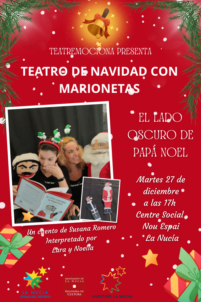 Esta tarde continúa la programación del “Nadal Infantil Cultural 2022-2023” de La Nucía con la sesión de cuenta cuentos “El Lado Oscuro de Papá Noel”. Esta obra teatral tendrá lugar hoy a las 17 horas en el Centro Social Nou Espai.