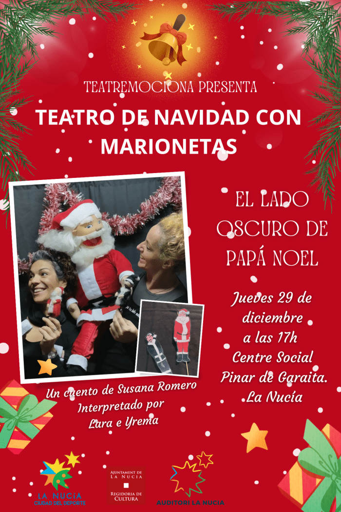 Tercera sesión de la programación del “Nadal Infantil Cultural 2022-2023” de La Nucía con la sesión de cuenta cuentos “El Lado Oscuro de Papá Noel”. Esta obra teatral tendrá lugar hoy a las 17 horas en el Centro Social Pinar de Garaita.