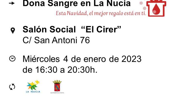 La primera donación de sangre del próximo año será el miércoles 4 de enero de 16,30 a 20,30 horas en el Salón Social El Cirer. El Centro de Transfusión de la Comunidad Valenciana se desplaza a La Nucía para esta nueva captación de sangre. Para donar sangre no es necesario preinscribirse, ni tener carnet de donante. Desde la concejalía de Sanidad se recuerda que “la sangre es muy necesaria en los Hospitales de la provincia”, por lo que hace un llamamiento a la donación de sangre.