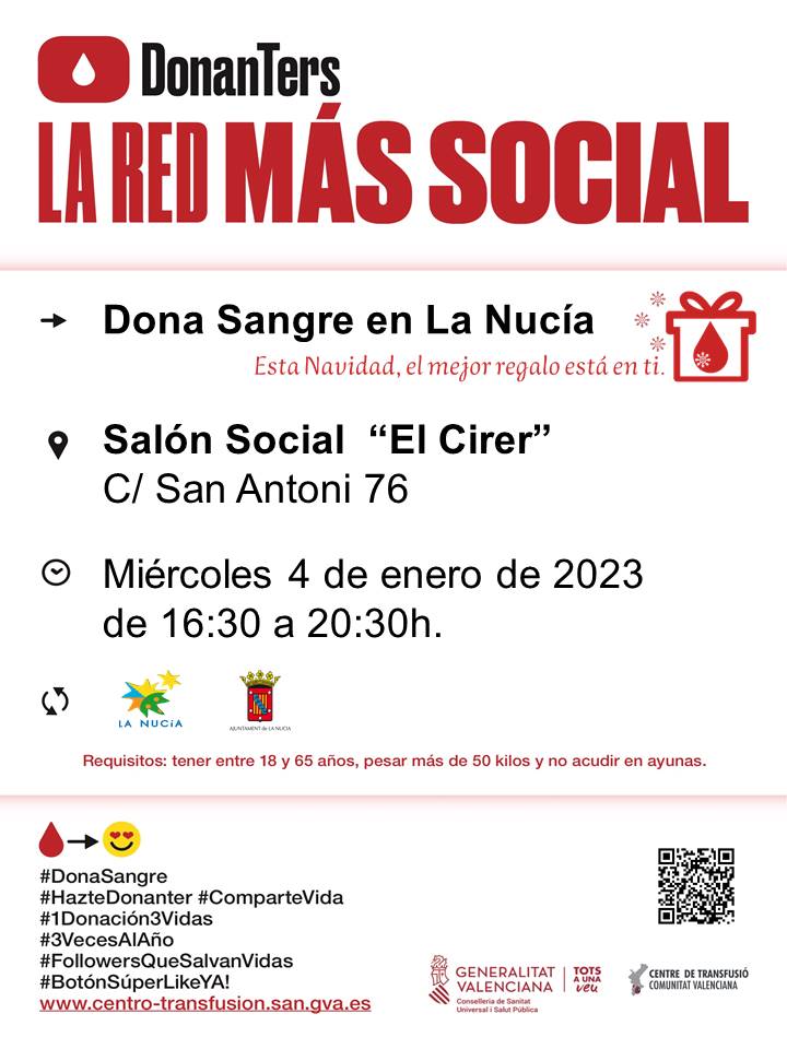 El Centro de Transfusión de la Comunidad Valenciana se desplaza a La Nucía para realizar la primera captación de sangre de 2023, el próximo miércoles 4 de enero. Los requisitos generales para donar sangre son ser mayor de 18 años y menor de 65 años y pesar más de 50 kilos. Es imprescindible beber abundantemente y comer antes de donar sangre y se puede donar, aunque se tenga el colesterol elevado.