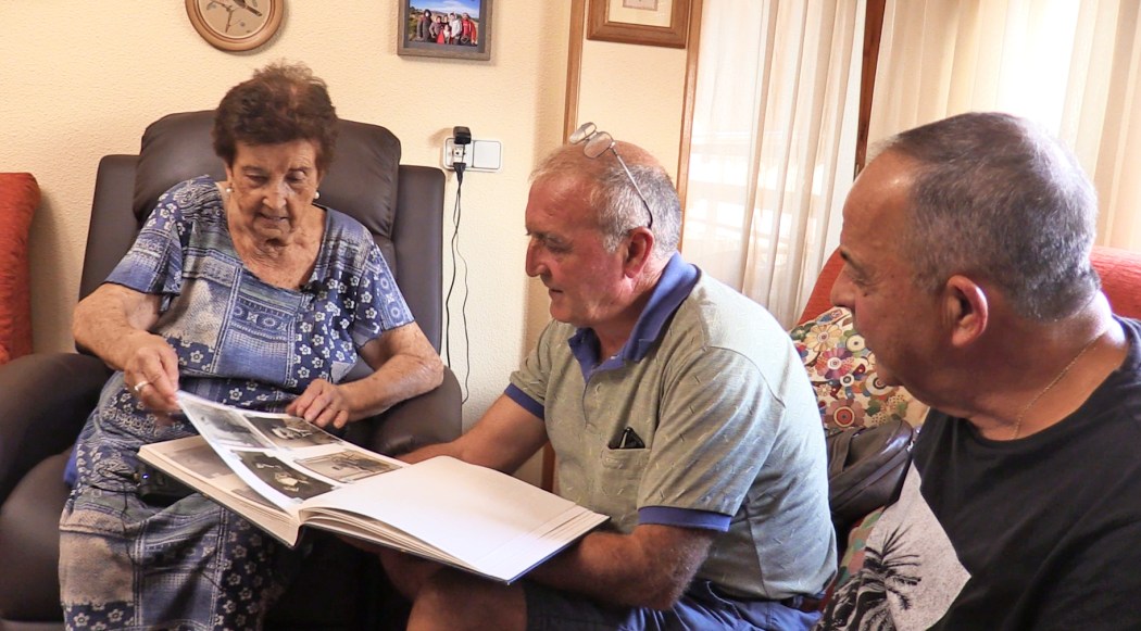 Fotografía: Lolita Escrig con un familiar y un voluntario de Vilamuseu, en la entrevista sobre su padre, el capitán de la Compañía Trasmediterránea Pedro Escrig Mayor.
