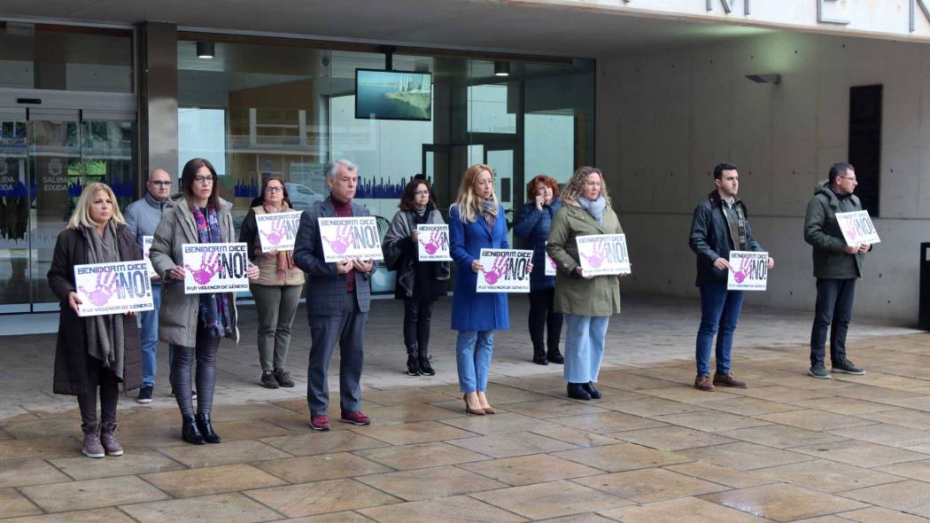 El Ayuntamiento de Benidorm ha mostrado hoy su repulsa y condena por los últimos crímenes por violencia machista ocurridos en Lleida y Valladolid, en los que fueron asesinadas dos mujeres y una menor de edad, con una concentración silenciosa en la plaza de SS MM Los Reyes de España. A la cabeza de la concentración silenciosa ha estado la primera teniente de alcalde, Ana Pellicer, y la concejal de Igualdad, Ángela Zaragozí, junto a miembros de la corporación municipal.