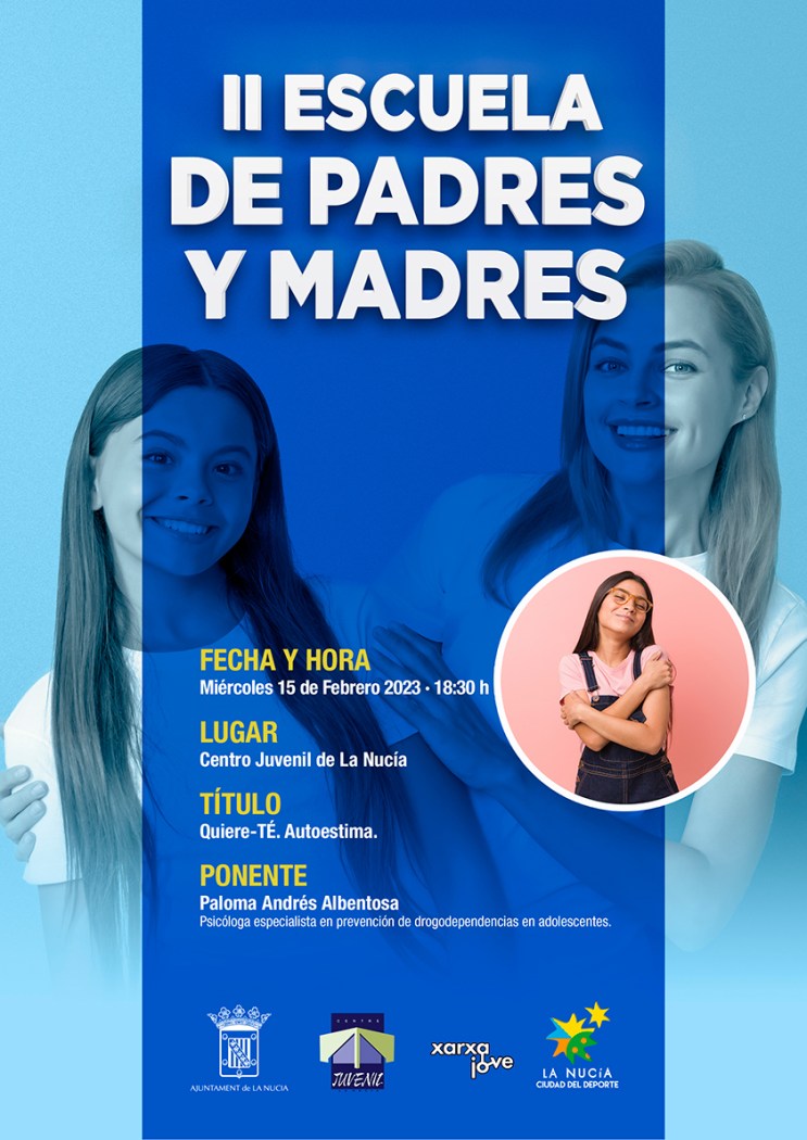 Esta tarde a las 18,30 horas en el Centre Juvenil tendrá lugar la cuarta charla de la “II Escuela de Madres y Padres” de La Nucía. El título de la conferencia será “Quiere-TÉ”, y en ella se hablará sobre los importantes cambios que se producen en la etapa de la adolescencia. Así como los factores que afectan al equilibro emocional en los jóvenes. Esta charla será impartida por Paloma Andrés Albentosa, psicóloga especialista en prevención de drogodependencias en adolescentes.