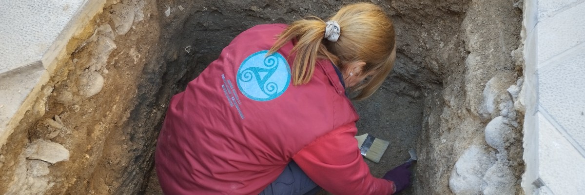 El sondeo ha sido dirigido por la arqueóloga Ruth Falcó Martí, junto a trabajos de seguimiento arqueológico y de arqueología de la arquitectura de las fachadas, para conocer su estado original y determinar, entre otras cosas, el color de los morteros a utilizar en su superficie. En la cata (de 1×1 metros y 0’80 metros de profundidad), bajo el pavimento actual de la plaza, a 30 centímetros, empieza un nivel de enterramiento de casi medio metro de potencia, con restos óseos humanos revueltos y cerámicas que coinciden con las fechas de este cementerio parroquial, desde el siglo XIV al XIX. Los restos están muy alterados por la humedad del suelo.