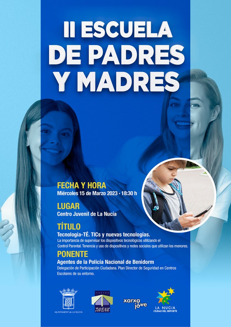 Este miércoles 15 de febrero a las 18,30 horas en el Centre Juvenil tendrá lugar la quinta charla de la “II Escuela de Madres y Padres” de La Nucía. El título de la conferencia será “Tecnología-TÉ”, y en ella se hablará sobre la importancia de supervisar los dispositivos tecnológicos utilizando el control parental. También se tratarán cuestiones relacionadas con la tenencia y uso de dispositivos electrónicos, redes sociales y videojuegos que utilizan nuestr@s hij@s. Esta charla será impartida por agentes de Policia Nacional de Benidorm.