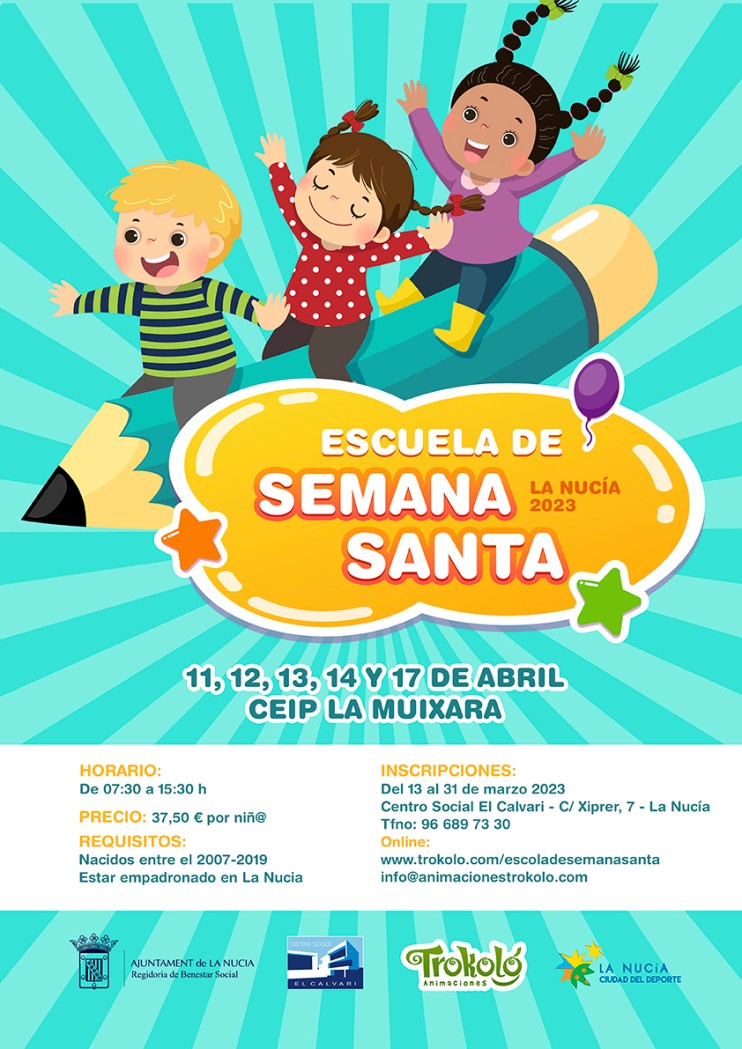 Esta semana se ha abierto el plazo de inscripción la Escuela de Semana Santa de La Nucía 2023 que finalizará el 31 de marzo. El objetivo de esta iniciativa es propiciar la conciliación de la vida laboral y familiar durante las vacaciones escolares de Semana Santa. Esta actividad se desarrollará durante los días laborales de las vacaciones escolares de Semana Santa: 11, 12, 13, 14 y 17 de abril de 2023 en el Colegio Muixara.