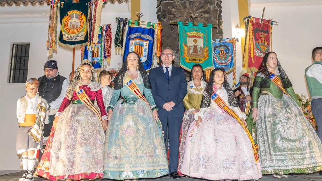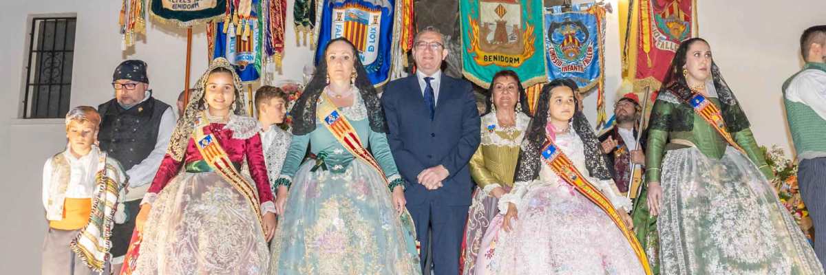 Encabezaban la comitiva la presidenta de la Junta Local Fallera, Ana Finez; y las falleras mayor e infantil de las Fallas Rincón de Loix y Benidorm, Laura Gálvez y Valentina Romero y Sonia Ferré e Isabella Sola, junto a miembros de las tres comisiones a quienes se sumaron las reinas Mayor e Infantil de les Festes Majors Patronals, Angélica Morenilla y Daniela Talavera, todos ellos acompañados por pasodobles falleros y melodías de ‘xirimita’ y ‘tabalet’.