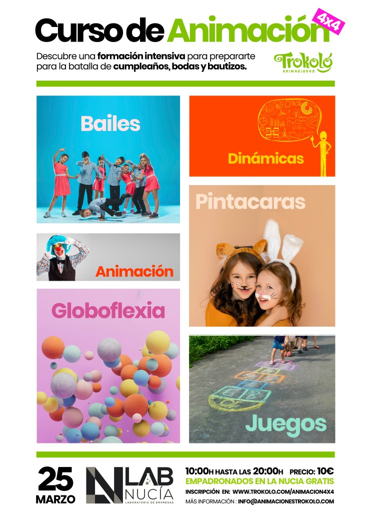 Este sábado 25 de marzo de marzo se realizará un curso de formación de Animación en Lab Nucia. La jornada comenzará a las 10 horas e incluirá contenido téorico y práctico con la finalidad de formar a animadores. Este taller tiene un coste de 10 euros y es totalmente gratuito para empadronad@s en La Nucía. La jornada está organizada por Lab Nucia junto a Trokoló Animaciones y las inscripciones se realizan en la página: https://www.trokolo.com/animacion4x4/
