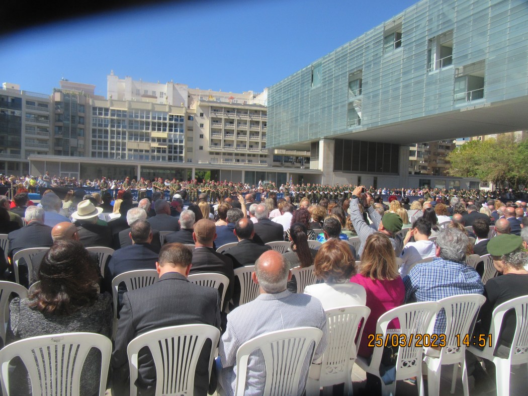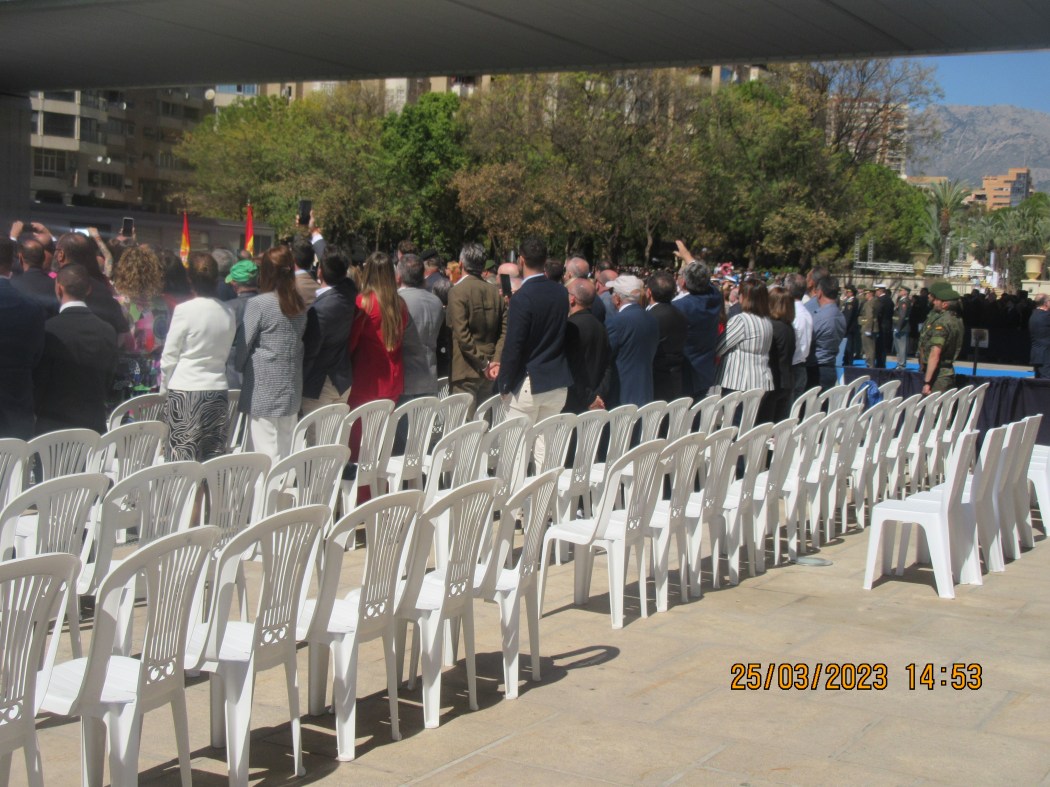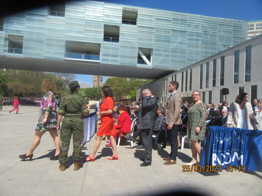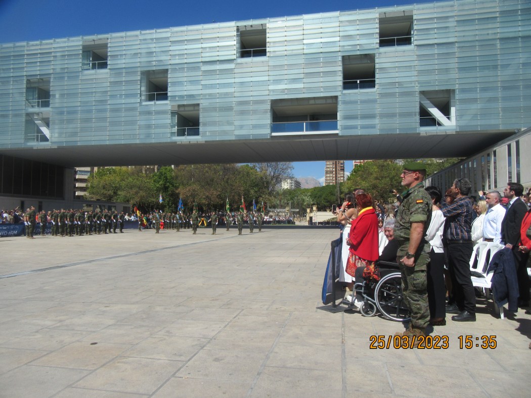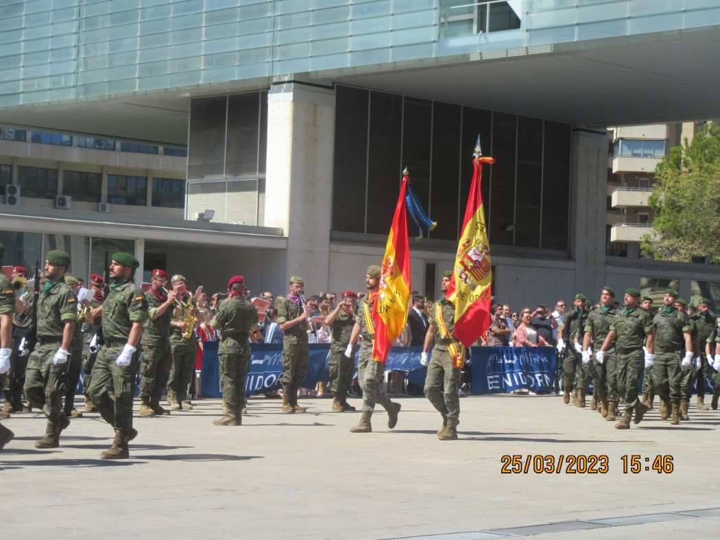 referirme al acto de la jura de bandera que, unas 500 personas, lo asumieron perfectamente. Cabe mencionar la importante cantidad de mujeres que juraron. Yo, por mi parte, es la tercera vez que presto juramento: la 1º cuando ingrese voluntario en el cuerpo del aire(Aviación de Rabasa).Fui voluntario y destinado a cocheras, me dieron una moto,modelo Sangla que utilice el tiempo de todo mi servicio militar. Éramos 128 alicantinos de pura cepa y esa quinta se llamó “MARZO EL BUENO”. En CANFALI de papel estuve varios años haciéndome eco de nuestras reuniones que mantuvimos, más de 15 años. Este contacto anual se ha perdido, por desgracia, por el fallecimiento de ESPOSAS que eran las que no daba ánimo y fuerza para no dejarlo, la muerte nos ganó la batalla a “MARZO EL BUENO”. La segunda jura de bandera que hice fue a la celebración de las bodas de oro a partir de terminar el servicio militar. Tanto en los 2 años de mili, como después, mi mujer fue, como el resto de las esposas de mis compañeros, un soldado más.Doy las gracias a Dios por esta tercera vez que juró la bandera de ESPAÑA.