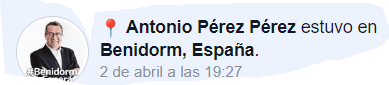 Antonio Pérez Pérez estuvo en Benidorm, España.2 de abril a las 19:27 Ver visita    Maite La Pineta, Joserra González Zarate, Paco B Benidorm y 89 personas más reaccionaron a esto.