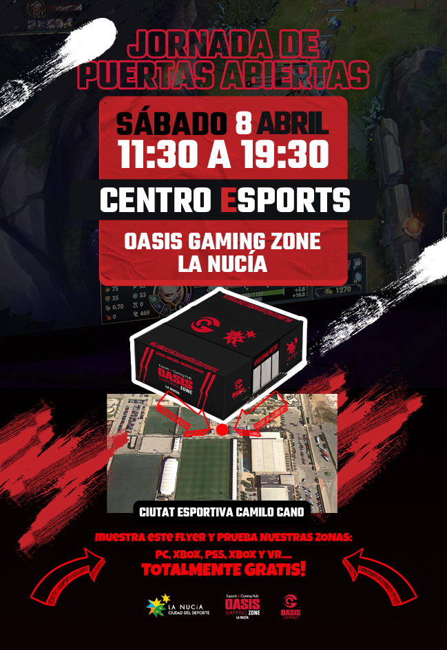 Este sábado 8 de abril de 11,30 a 19,30 horas se celebrará la jornada de puertas abiertas del “Centro de E-Sports y Gaming” de La Nucía, ubicado en la Ciutat Esportiva Camilo Cano. El objetivo de esta jornada es dar a conocer todas las actividades formativas y de ocio que oferta “Oasis Gaming La Nucía”. El acceso al público será gratuito que durante toda la jornada de puertas abiertas. Los asistentes podrán probar la Zona PC y la Zona de cónsolas-Gaming y jugar a sus videojuegos favoritos.