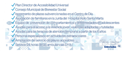 En definitiva, la puesta en marcha de las iniciativas que contempla el programa electoral del Partido Popular en el apartado de políticas sociales supondrá afianzar la colaboración entre el consistorio y cada asociación social y cada ciudadano que necesite de estos servicios específicos.