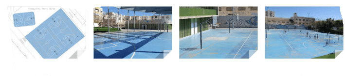 Para revertir esta situación, una vez concluidos los trabajos previos de vallado, señalización de la zona de actuación y desmontado del equipamiento deportivo existente, se procederá al lijado de la superficie de hormigón de las pistas deportivas y limpieza de toda la superficie para eliminar restos de la resina anterior para posteriormente ejecutar una pista multicapa sobre asfalto compuesta de 3 capas: capa de regularización, capa intermedia para dar textura y color, y capa de sellado y finalización. Así mismo, también se realizarán las cimentaciones oportunas para el montaje de las canastas fijas de minibásket. Finalmente, se darán los trabajos de limpieza, pintado de superficie y marcaje de pista; y la sustitución de red parabalones, tablero de metacrilato y aro basculante, y el montaje de juego de canastas de minibásket fijas.