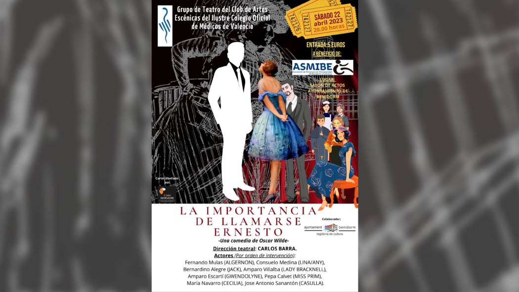 El grupo de teatro del Club de Artes Escénicas del Ilustre Colegio Oficial de Médicos de Valencia representa este sábado, 22 de abril, la obra ‘La importancia de llamarse Ernesto’ a beneficio de la Asociación de Minusválidos de Benidorm (Asmibe). La representación está prevista las 20.00 horas en el Salón de Actos del Ayuntamiento y el precio de la entrada será de 5 euros.