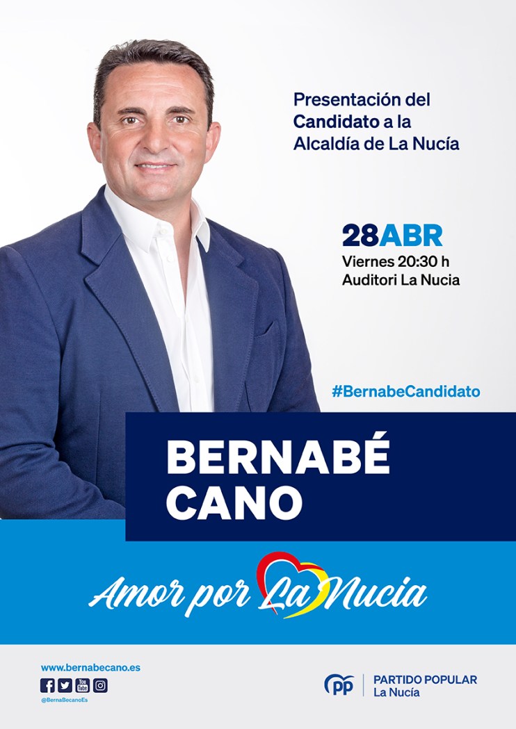 El acto de “Presentación de Bernabé Cano como candidato a la alcaldía de La Nucía” será el viernes 28 de abril a las 20,30 horas en l’Auditori de La Nucía.