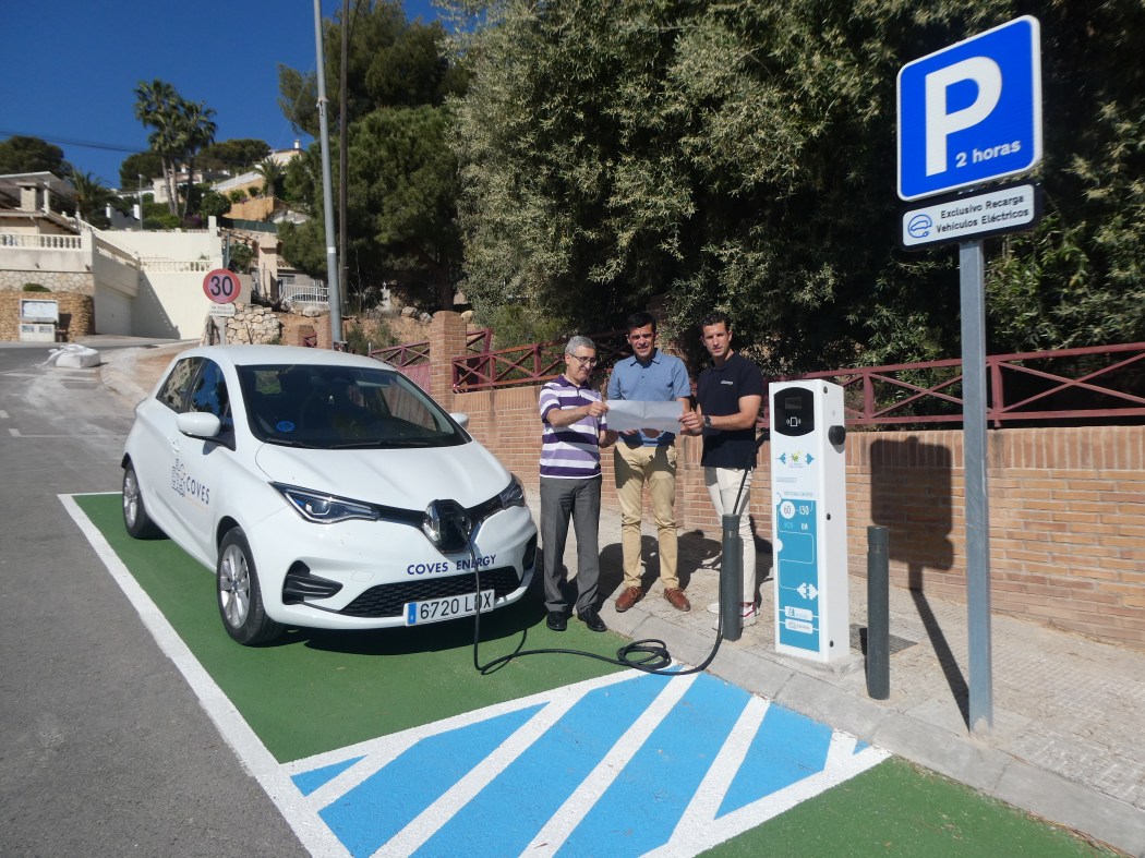 Esta semana se han realizado las pruebas y puesta a punto de este nuevo doble punto de Recarga de Vehículos Eléctricos, situado en la urbanización El Tossal, concretamente en el carrer Mar de Liguria, justo en la entrada de esta zona residencial. En ellas estuvieron Fran García, ingeniero técnico municipal y Miguel Ángel Ivorra, concejal de Urbanismo junto a Eduardo Martínez, director Movilidad Eléctrica de Coves Energy, empresa que ha realizado esa actuación.