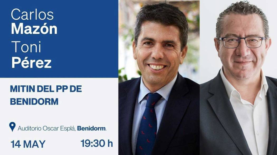 El próximo 14 de marzo, el Auditorio Óscar Esplá del Parque de la Aigüera de Benidorm acogerá un mitin del Partido Popular. El evento, que comenzará a las 19.30 horas, contará con la participación de Toni Pérez, candidato a la alcaldía de Benidorm, y Carlos Mazón, candidato del PP a la presidencia de la Generalitat Valenciana.