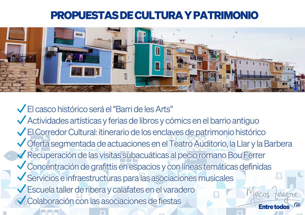 Dada la importancia patrimonial de Villajoyosa, se apostará por la restauración y musealización de cada monumento, como el yacimiento de las Termas de Allon. Además, el candidato aboga por recuperar las visitas subacuáticas al pecio romano Bou Ferrer y el programa Carrers i Partides de la Vila, así como crear la escuela taller de ribera y calafates en el varadero con el fin de recuperar antiguos oficios. En su línea de actuación destacan las visitas guiadas a los monumentos y edificios históricos, actividades en la Biblioteca y Vilamuseu; la exposición permanente de Vilamuseu, el Museu de la Festa… También destacan iniciativas para promocionar las tradiciones y costumbres locales, así como la colaboración con la celebración de las fiestas patronales de Moros y Cristianos y las propias de cada barrio.