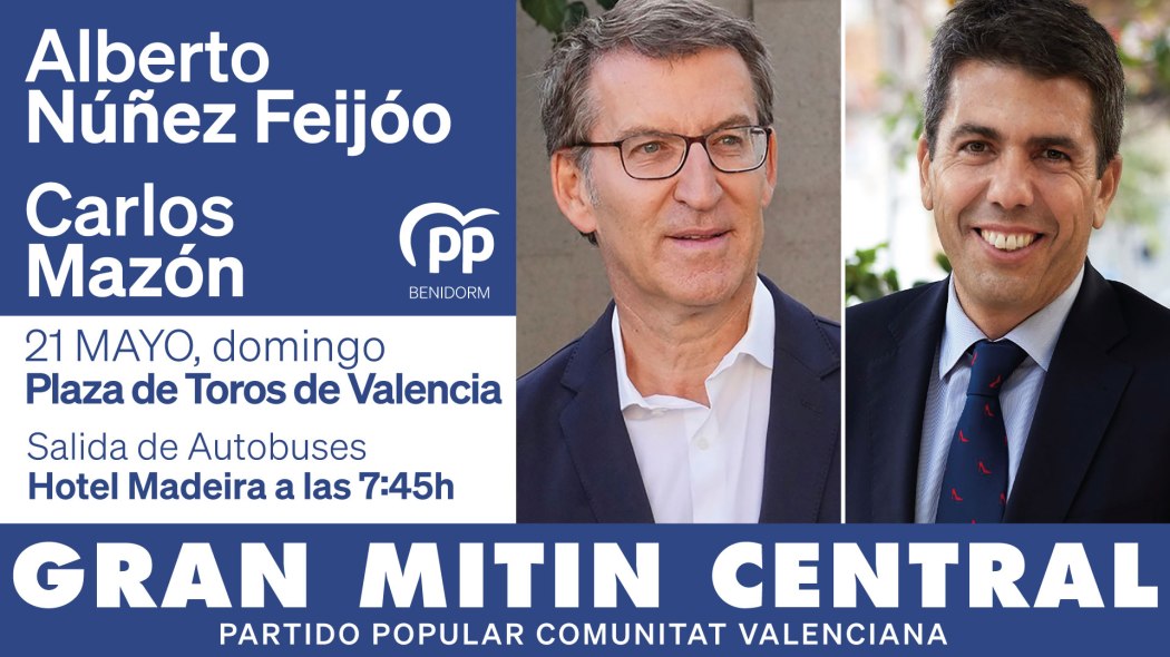 Con motivo del evento, el Partido Popular de Benidorm ha organizado un viaje para afiliados y simpatizantes que saldrá a las 7.45 del domingo desde el Hotel Madeira y regresará al finalizar el mitin. Las personas que estén interesadas en asistir, pueden acudir a la sede del partido en la calle Rioja, 6 de Benidorm.