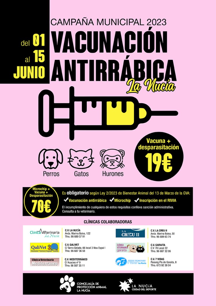 El Ayuntamiento de La Nucía informa que la “Campaña Municipal de Vacunación Antirrábica 2023” será del 1 al 15 de junio. La concejalía de Protección Animal ha llegado a un acuerdo con seis Clínicas Veterinarias de La Nucía para que el precio de la vacuna y desparasitación del animal sea de 19 €, para empadronados y empadronadas en La Nucía.