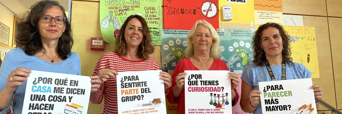 De esta forma la recién creada Unidad de Prevención Comunitaria en Conductas Adictivas (UPCCA) de La Nucía se ha sumado a la campaña autonómica de la Red de UPCCAs de la Comunittat Valenciana para concienciar y sensibilizar el 31 de mayo, Día Mundial Sin Tabaco, con el lema “Más sentido común, menos tabaco”. Esta mañana con motivo de esta acción de concienciación ha visitado el Instituto de La Nucía Paloma Andrés, psicóloga que realiza los Talleres de la UPCCAs y Beatriz Pérez-Hickman, concejala de Bienestar Social en funciones, acompañadas por Amparo García y Empar Gadea, vicedirectora y directora del IES La Nucía.