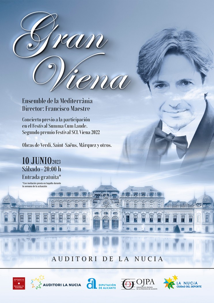 La orquesta sinfónica “Ensemble de la Mediterrània” vuelve a actuar en l’Auditori de La Nucía, bajo la dirección de Francisco Maestre. Este concierto titulado “Gran Viena” será este sábado 10 de junio a las 20 horas. La entrada es gratuita con invitación a recoger durante esta semana en las taquillas de l’Auditori.