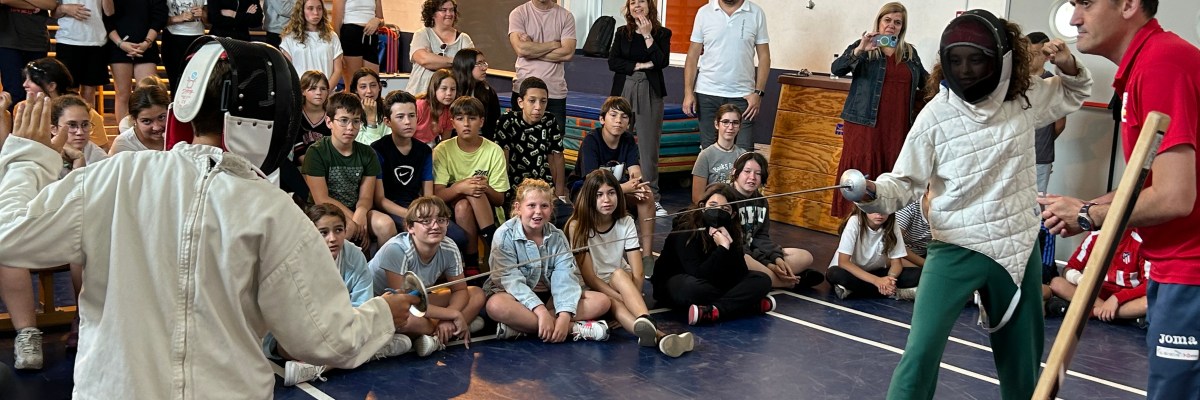 En la mañana de hoy 60 alumn@s de sexto de primaria del colegio Muixara han recibido la visita de una delegación del COE (Comité Olímpico Español), que les ha ofrecido una charla divulgativa sobre los Juegos Olímpicos y los valores del deporte. Los olímpicos Javier García (esgrima) y María Ribera (rugby), han sido los encargados de dirigir esta sesión teórica y práctica para el alumnado nuciero.