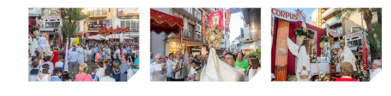 La procesión realizó tres paradas, en La Palmera, en el Paseo de la Carretera y en la Plaza de Sant Jaume. En estos puntos, desde primera hora de la mañana, los socios de la ACR ‘La Barqueta’ trabajaron diseñando y creando tapices de flores y ‘murta’. En ellos, con la llegada de comulgantes y acompañantes y del aroma del humo del incensario, se anunciaba el momento del rezó mientras los fieles lanzaban pétalos de rosas.