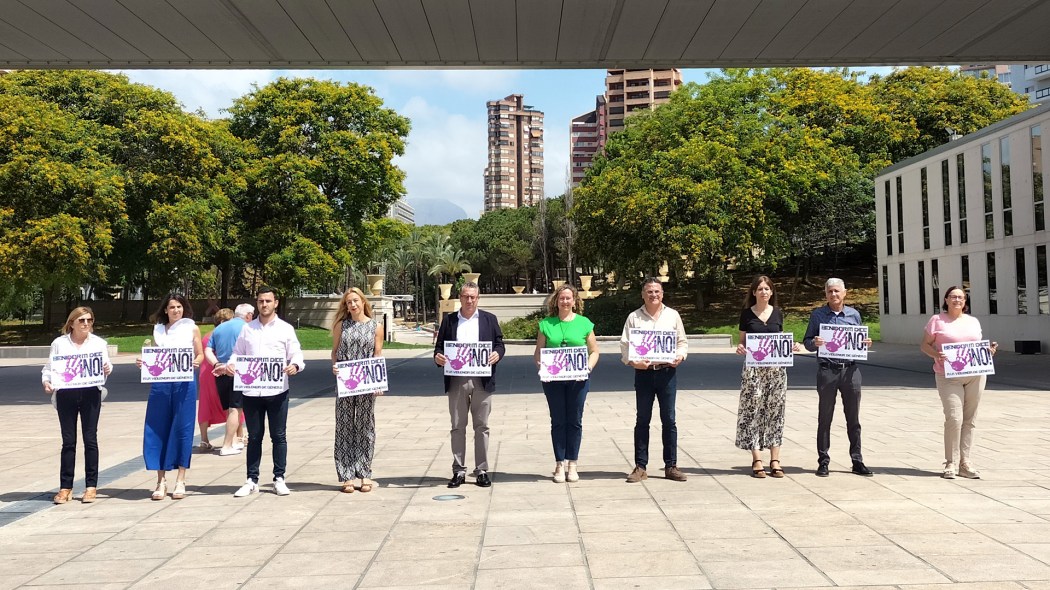 Con una concentración silenciosa en la Plaza SSMM Reyes de España, miembros de la Corporación municipal de Benidorm, encabezados por el alcalde, Toni Pérez, y la concejal en funciones de Igualdad, Ángela Zaragozí, han mostrado su repulsa ante el último asesinato por violencia de género registrado el pasado fin de semana.