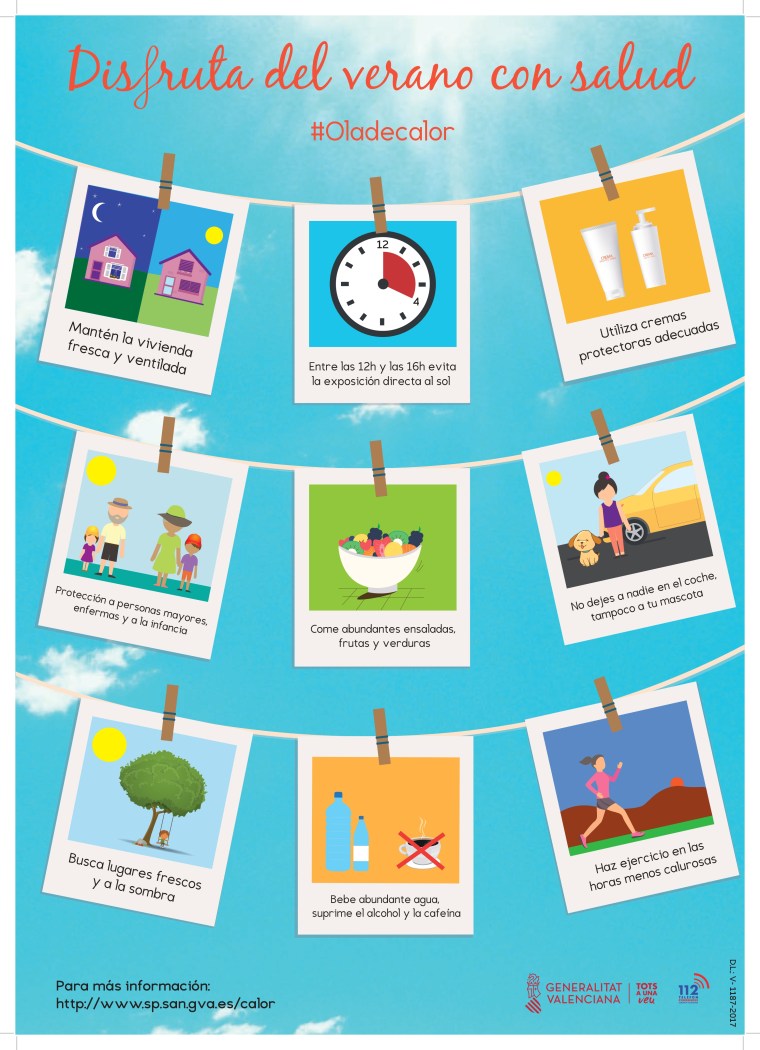 El Ayuntamiento de La Nucía informa sobre la Campaña sobre “Disfruta del Verano con Salud, #OladeCalor” que está realizando la Generalitat Valenciana, para dar consejos a la ciudadanía sobre cómo actuar ante los episodios de altas temperaturas durante el verano. La campaña se ha realizado a través de diferentes carteles y trípticos, que se colgarán en la web municipal de La Nucía.