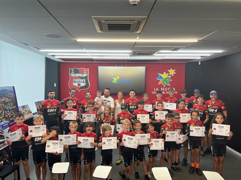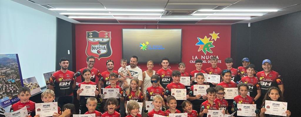 Con la entrega de diplomas en el Centro BTT de la Ciutat Esportiva Camilo Cano finalizó ayer el curso 2022-2023 de la Escuela de Bicis de Montaña “La Nucía Coloma Bike Club”. Es el segundo curso que finaliza esta escuela de bicis de montaña que cuenta con el apoyo del Ayuntamiento de La Nucía, que ha facilitado sus instalaciones en la Ciudad Deportiva Camilo Cano. El acto de entrega de diplomas contó con la presencia de Dani Saez, coordinador de Escuelas Coloma Bike Club y los concejales de La Nucía Sergio Villalba y María Jesús Jumilla.