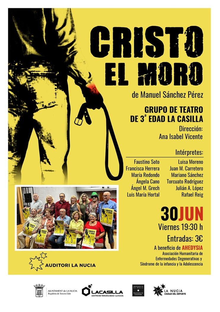 Será la primera vez que se interprete esta divertidísima obra teatral “Cristo El Moro” que tendrá un “estreno solidario”, ya que la recaudación de la venta de entradas va destinada a AHEDYSIA (Asociación Humanitaria de Enfermedades Degenerativas y Síndrome de la Infancia y la Adolescencia).