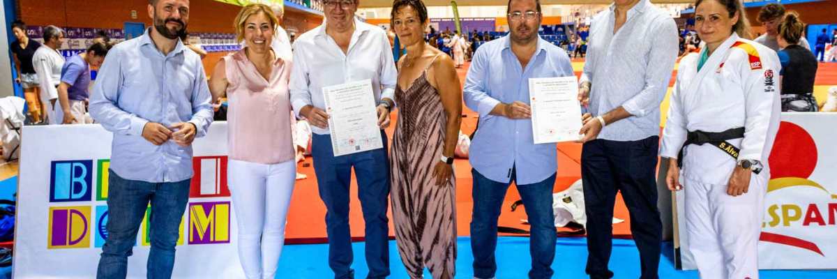 Con motivo de la celebración en el Palau d’Esports l’Illa de Benidorm del Benidorm EJU OTC 2023 organizado por la European Judo Unión que aglutina a 51 federaciones y asociaciones de este deporte, el alcalde de Benidorm, Toni Pérez, junto al diputado en el Congreso, Agustín Almodóbar, han recibido, de la Real Federación Española de Judo y Deportes Asociados el título de ‘Cinturón negro de judo’.