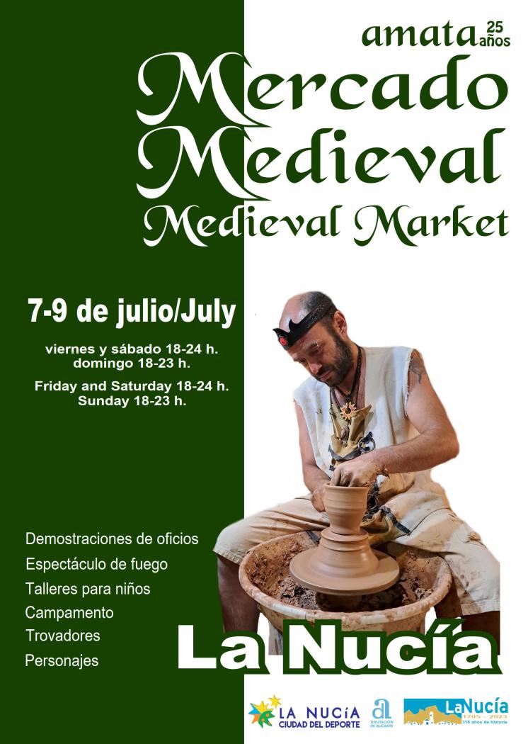 El Mercado Medieval es una iniciativa del Ayuntamiento de La Nucía para celebrar el 318 aniversario de la población (1705-2023) y está organizado por AMATA (Asociación para la Mejora de la Artesanía Tradicional y Actual), que garantiza que todos los puestos haya exclusivamente Artesanía de Autor. Los visitantes del Mercado Medieval encontrarán artesanía, gastronomía, teatro de calle, danzas, música, demostraciones de oficios y mucha animación durante tres intensos días.
