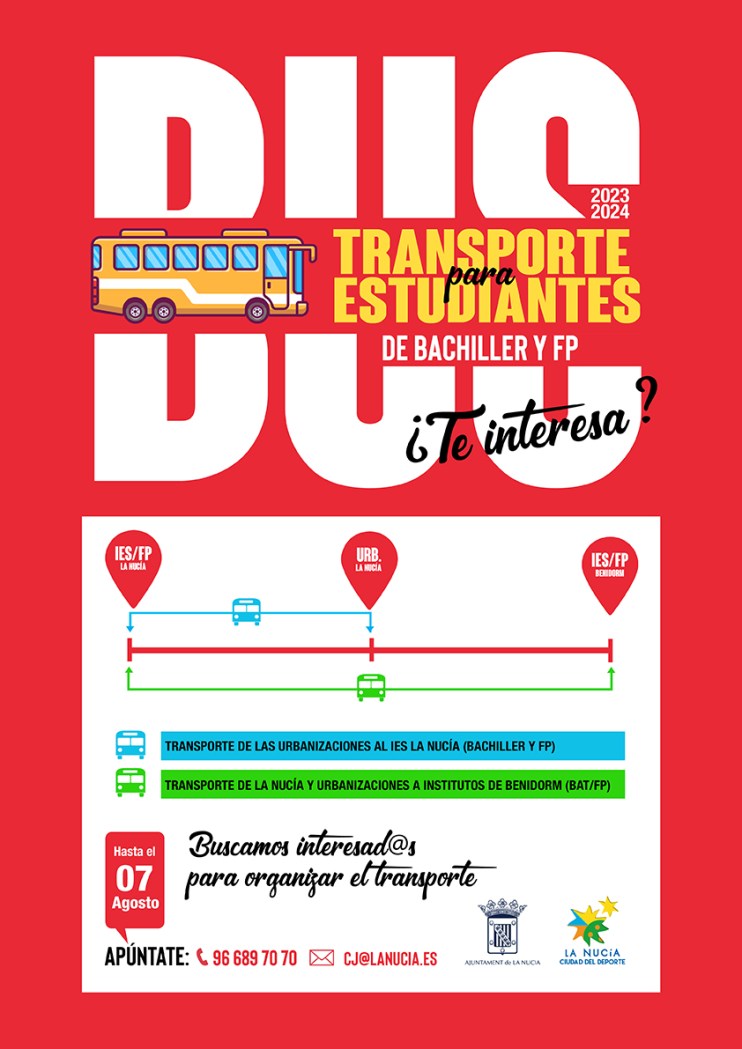 Ante las diferentes peticiones por parte del alumnado de Bachiller, FP de La Nucía y sus familias el Ayuntamiento va a intentar ayudar a las familias el próximo curso 2023-2024, en el tema del transporte por cuarto curso consecutivo, siempre que sea viable y haya un mínimo de alumnos por autobús.