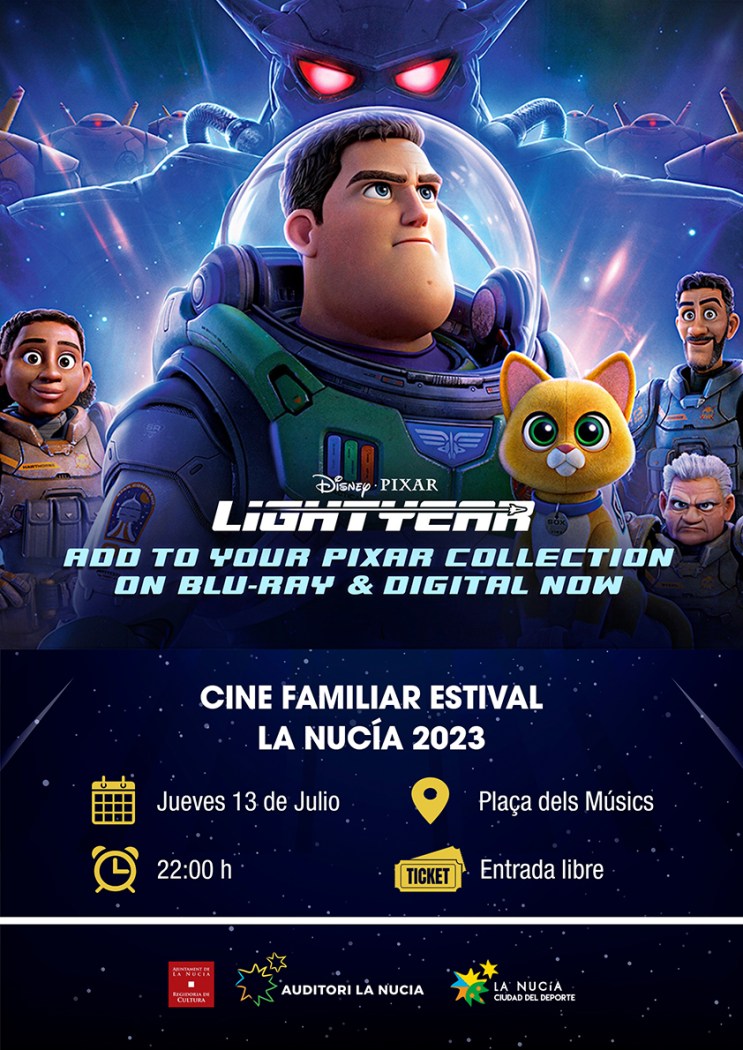 Mañana jueves 13 de julio a las 22 horas en la plaça dels Músics con la película animada “Lightyear” comienza el Ciclo de Cine Familiar Estival “Noches de película”. Esta edición de 2023 cuenta con un total de 13 proyecciones totalmente gratuitas, al aire libre, en la plaça dels Músics y plaza del Sol de La Nucía.