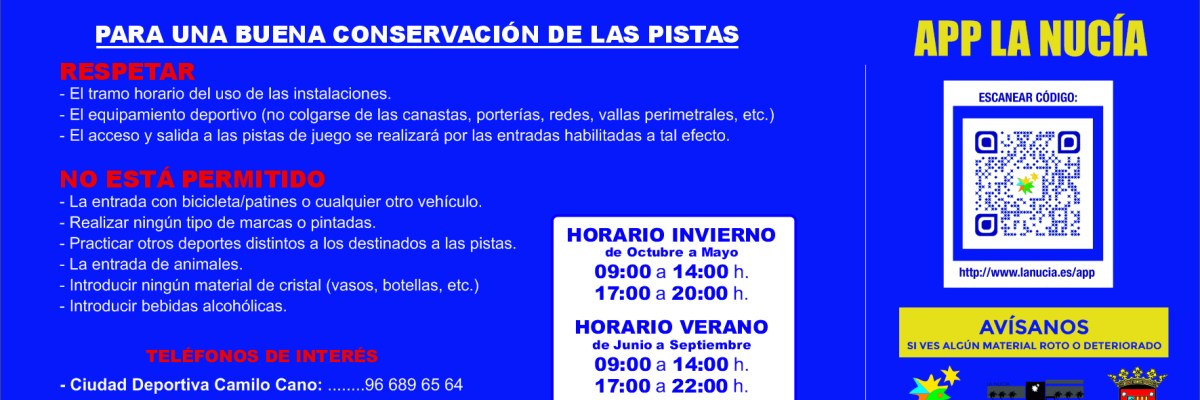 Todas las pistas deportivas municipales disponen en su puerta de acceso de un cartel informativo sobre los horarios, normas de uso, así como de teléfonos de contacto para incidencias. A lo largo del término municipal, el Ayuntamiento de La Nucía tiene a disposición de sus vecinos 14 pistas multideporte (además de las de futbol 3, petanca, tenis, etc.) para practicar deporte a 5 minutos de sus casas, descentralizando así servicios y acercarlos al ciudadano.