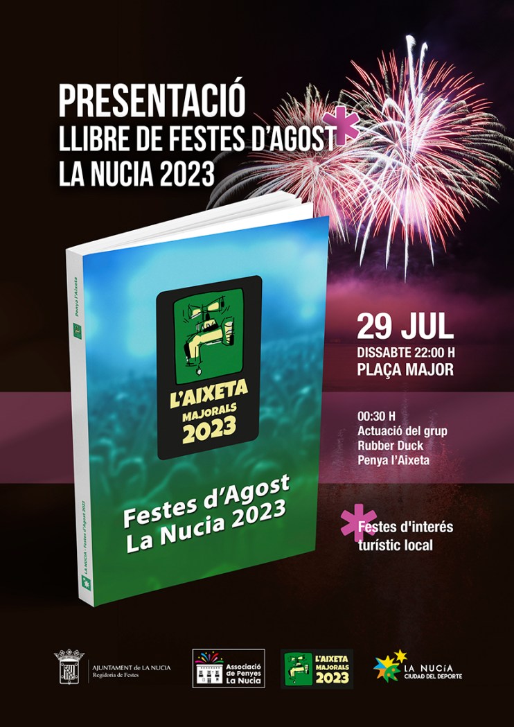 Este sábado 29 de julio a las 22,00 horas els Majorals 2023 Penya l’Aixeta presentarán el “Llibre de les Festes d’Agost 2023” en la plaça Major. En este acto de #LaNuciaEnFestes se dará a conocer las actuaciones musicales, mascletaes, correfoc y resto del programa de actos de les “Festes d’Agost 2023”. La entrada para la presentación del libro de fiestas es libre y gratuita. Con este acto comienza la cuenta atrás para las inminentes “Festes d’Agost” que arrancarán el 14 de agosto y se inicia el “trilogia prefestera nuciera”.