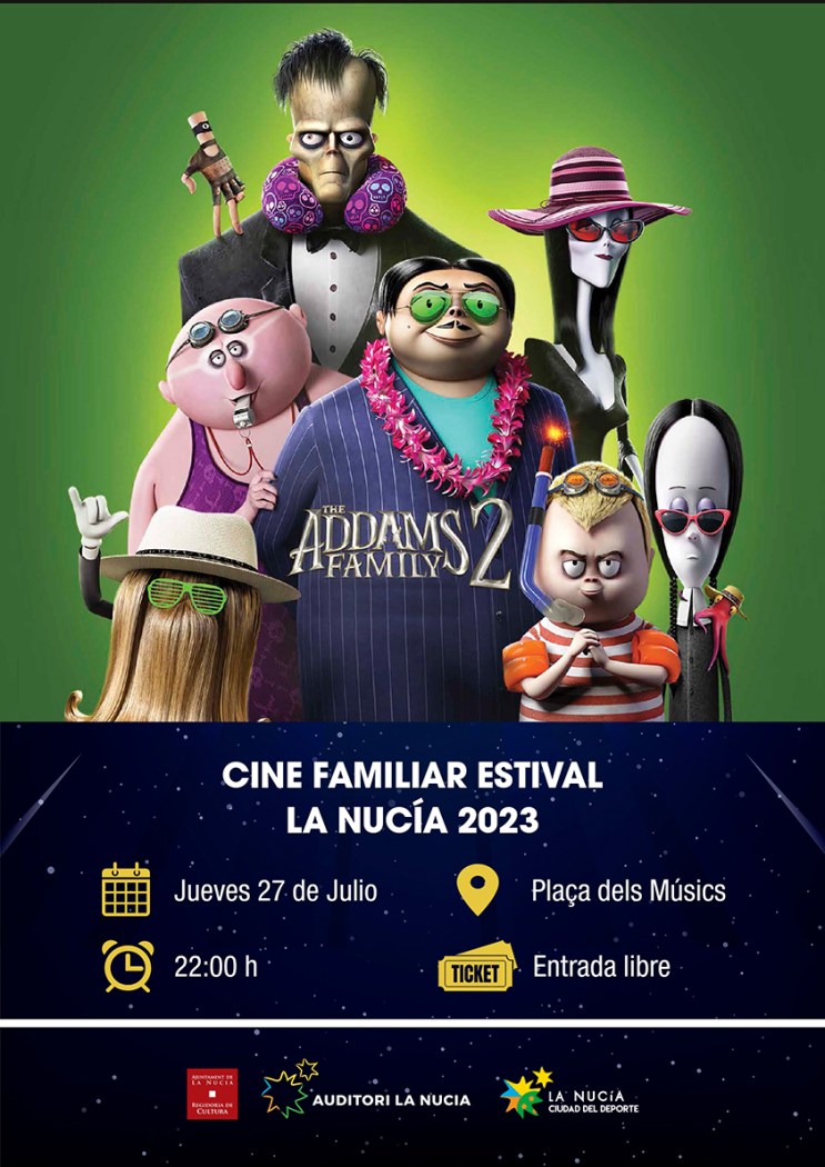 Tras “La familia Addams 2: La gran escapada”, las próximas películas de este Ciclo de Cine Familiar Estival de La Nucía 2023 son: “A todo tren. Destino Asturias” (1 agosto en plaza del Sol), “Jurassic World: Dominion” (3 de agosto en plaça dels Músics), “Top Gun: Maverick” (8 de agosto en plaza del Sol), “Mi querido monstruo” (10 agosto en plaça dels Músics), “Minions: El Origen de Gru” (22 agosto en plaza del Sol), “Padre No hay más que uno 3” (24 agosto en plaça dels Músics), “Los tipos malos” (29 de agosto en plaza del Sol) y “VII La Noche más corta” (jueves 31 de agosto en plaça dels Músics).