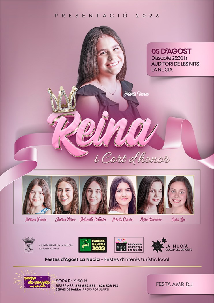 Marta Ferrer Pérez será presentada como reina de las fiestas 2023 junto a sus 6 damas de honor el próximo sábado 5 de agosto a las 23,30 horas en la plaça – Auditori de les Nits. Este acto de la “La Presentació” está organizado por els Majorals 2023 Penya L’Aixeta y la concejalía de Fiestas del Ayuntamiento de La Nucía. Segundo acto de la “trilogía prefestera nuciera”. La entrada será libre y gratuita.