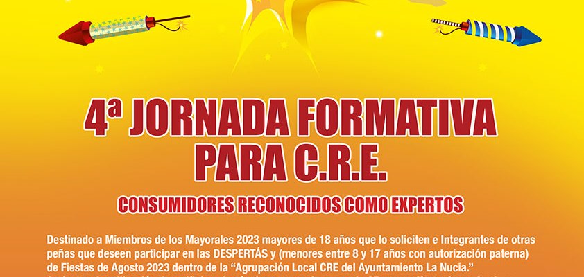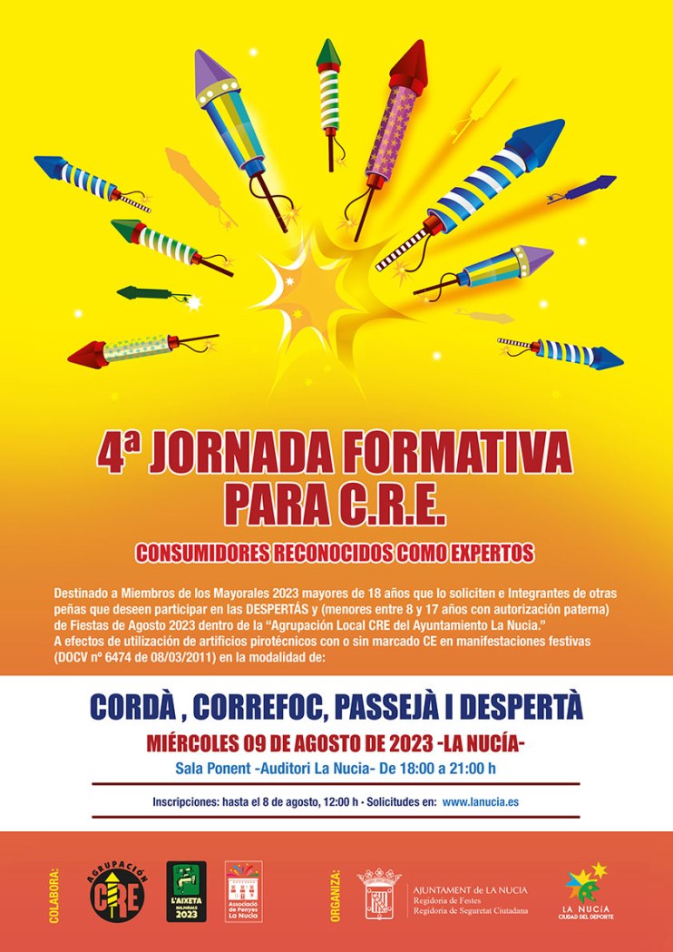 La cuarta “Jornada Formativa en Petardos para Consumidores Reconocidos como Expertos (C.R.E.)” será el miércoles 9 de agosto a las 18 horas en l’Auditori de La Nucia. Curso destinado a los Majorals 2023 y festeros de otras penyas de La Nucía, (únicamente de La Nucía) que deseen participar las “Despertaes 2023 de les Festes d’Agost”. Curso gratuito, que será impartido por el experto y responsable de la Agrupación CRE, Agustín Rubio. Es imprescindible rellenar hoja de inscripción https://forms.gle/7oVVFysJkJDH8MJk6 antes del 8 de agosto a las 12 horas.