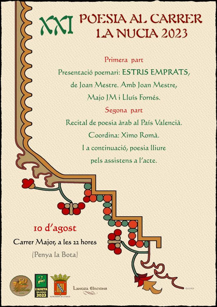 El “XXI Encontre de Poesia al Carrer” está organizado por Lanuza Edicions y la penya la Bota con la colaboración de las concejalías de Cultura y Fiestas del Ayuntamiento de La Nucía y els Majorals 2023 Penya L’Aixeta. La entrada a este encuentro de poesía es libre y gratuita.