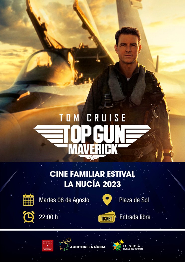 La película “Top Gun: Maverick” será la octava proyección de este ciclo de cine estival familiar de La Nucía 2023. Mañana martes 8 de agosto a las 22 horas en la plaza del Sol, los espectadores podrán disfrutar del cine al aire libre, bajo las estrellas. En esta película el Capitán Maverick (Tom Cruise) vuelve a la academia Top Gun, para entrenar a pilotos de élite.