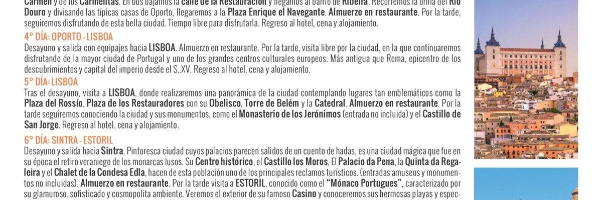 Este viaje con una duración de ocho días, incluye el viaje en autobús ida y vuelta y durante todo el recorrido, pensión completa, alojamiento, guía acompañante según itinerario y seguro de viajes. En el trayecto de ida se ha incluido una parada en la emblemática ciudad de Toledo con pernoctación incluida. El segundo día se saldrá en dirección a Oporto donde se han previsto tres días de estancia para conocer esta ciudad portuguesa. La segunda parte del viaje continuará en la ciudad de Lisboa desde donde también se realizará una excursión de un día a los municipios de Sintra y Estoril. El penúltimo día se iniciará el regreso hacia España incluyendo una parada y pernoctación en Mérida para visitar esta ciudad extremeña.