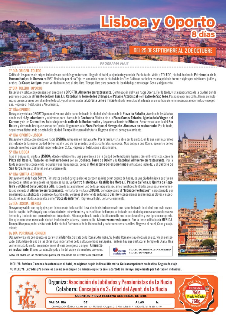 El viaje “Circuito por Lisboa y Oporto” tendrá lugar del 25 de septiembre al 2 de octubre y tiene un precio de 750 euros para los miembros de la Asociación (760 euros no socios), la apertura de inscripciones será el 28 de agosto en el Centro de la Tercera Edad “La Casilla” (teléfono 965082179). Las plazas son limitadas por ello se recomienda inscribirse lo antes posible (para formalizar la reserva es necesario abonar el importe de 350 € por persona).