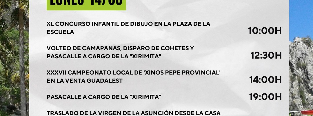 | El 14 de agosto Castell de Guadalest ya estarà de fiestas. J.M.P. Castell de Guadalest también celebra sus fiestas en agosto y más concretamente en honor a la Virgen de la Asunción. Este año darán inicio el lunes 14 de agosto y más concretamente a las diez horas con el concurso de dibujo infantil en la plaza de la escuela. A las 14 horas concurso de Xinos en la venta Guadalest. A las 21:30 traslado de la virgen al templo parroquial y cierra el día la actuación de la orquesta Avalanxa en la plaza de la casa de cultura a las 23:30 horas. Martes se inicia la fiestas a las 10:30 horas con el pasacalle de la bandeta de Bérnia y a las doce horas ofrenda de flores. Ya por la tarde a las 19 horas actuación del grupo de danzas de Muro y a las diez de la noche barbacoa en la plaza de la casa de cultura. A las 23:30 horas Tributo musical a los 80 y 90. Miércoles por la mañana pasacalles y misa. En la misa a San Roque actúan los Cantores de Alcoy. Por la tarde es el momento para los más pequeños con inflables, fiesta de la espuma y merienda, todo amenizado por la banda de Tárbena. A las ocho de la tarde mariachis en la plaza y a las once y media de la noche fiesta de disfraces. A continuación cierra la noche la discoMovil Mateu. El jueves será el último día festivo en Guadalest. Pasacalles y misa donde actuará el dúo Bach de Altea. A las ocho y media solemne procesión y los actos festivos finalizan con la actuación de la Orquesta Madre Selva a las 00:30 horas. Esto es un breve resumen festivo de lo que pueden disfrutar en las fiestas de Castell de Guadalest. |