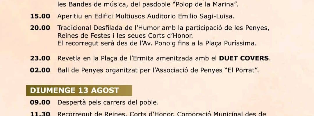 Ya el domingo 13 despertà a las 9 de la mañana. A las 12 del mediodía misa. A las 14 horas, aperitivo en el edificio Multiusos. A las cinco de la tarde inflables para los más pequeños en la plaza de la Ermita. A las 19 horas batalla de las bandas de las fiestas en els Xorros donde la mejor interpretación será premiada. A las once de la noche Dj Corfa y a las dos de la noche será el turno para la segunda banda en el popular Baile de Peñas.