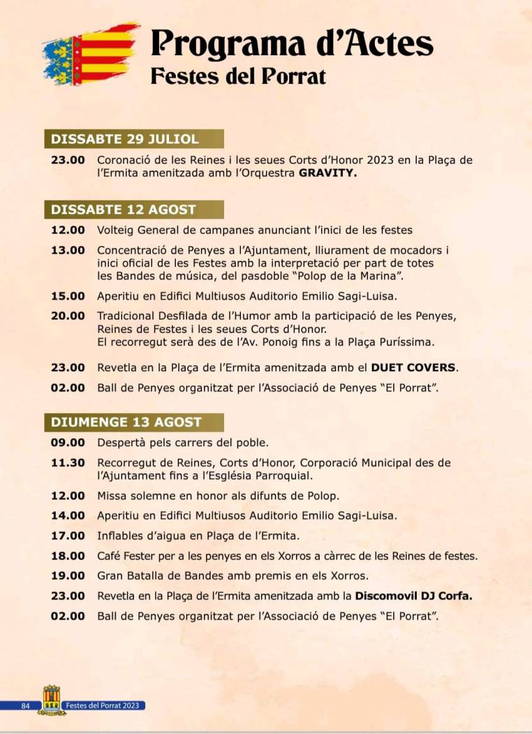 J.M.P. En su día Polop recibió el derecho de celebrar feria (Porrat) el 15 de agosto en honor a San Roque, santo que tiene la fama de evitar las epidemias. A partir de ese momento la localidad de la Marina Baixa celebra dicha festividad. Centrándonos en las fiestas del 2023, vamos a repasar los diversos actos festivos que tendrán lugar en Polop. La fiesta empieza el sábado 12 de agosto y más concretamente a las 13 horas enfrente de la balconada consistorial. Es lugar de reunión de festeros y músicos donde se realizará el reparto de pañuelos festeros y se interpretará el himno de las fiestas, el pasodoble Polop de la Marina. Tras la explosión festiva, todos se dirigen al edificio multiusos donde tendrá lugar el tradicional aperitivo festero. Tras un descanso llega el famoso desfile del humor donde peñas y músicos ponen el toque alegre a las fiestas. A las once de la noche actuación de Duet Covers en la plaza de la Ermita y a las dos de la noche primer baile de peñas con la actuación de la primera banda de música que amenizará la noche polopina.