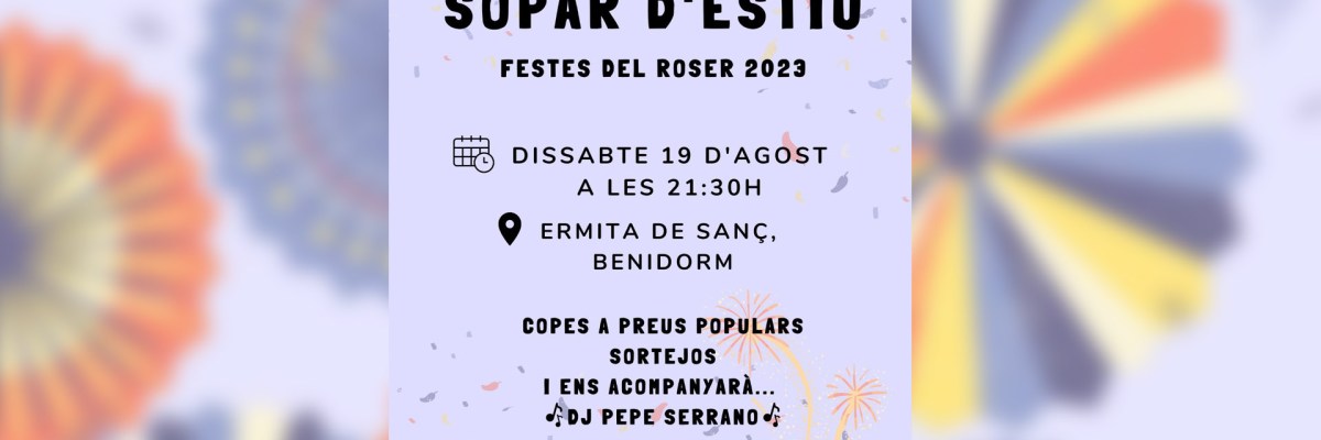 Les Festes del Roser celebrarán este próximo sábado 19 de agosto su tradicional ‘Sopar d’Estiu’ que tendrá lugar en la Ermita de Sanz de Benidorm a partir de las 21,30 horas de la noche. Se trata de una cita muy esperada e ineludible en el calendario festero de la ciudad y de la zona de la huerta en particular.